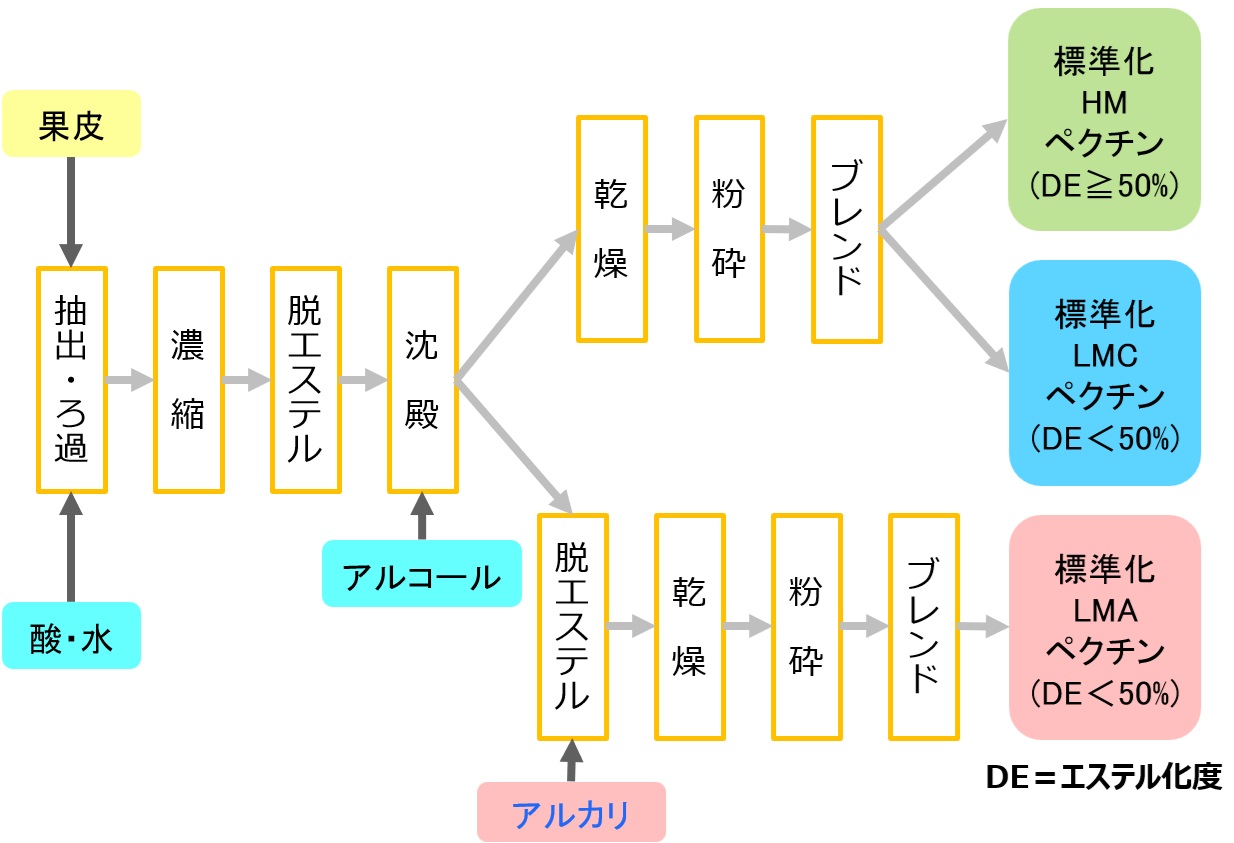 LMペクチン製造時に酸で処理した製品を酸処理ペクチン:LMC*(Conventional)ペクチン、アルカリで処理した製品をアルカリ処理ペクチンLMA(Amidated)ペクチンといいます。