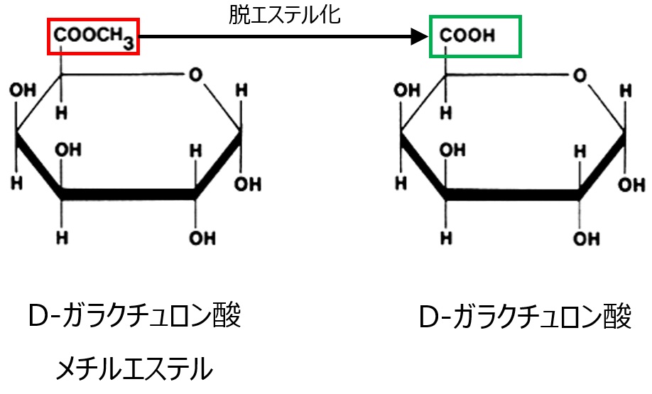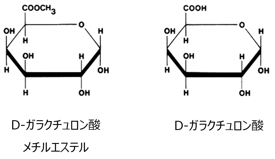 ペクチンの基本構造は、直鎖状にD-ガラクチュロン酸同士がαー1,4グリコシド結合したもので、部分的にカルボキシル基がメチルエステル化されています。
