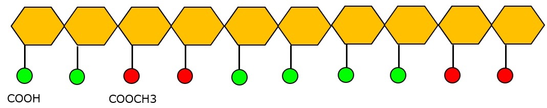 下の図の場合、ガラクチュロン酸10個のうちメチルエステル基が4個あるため、エステル化度40のLMペクチンとなります。