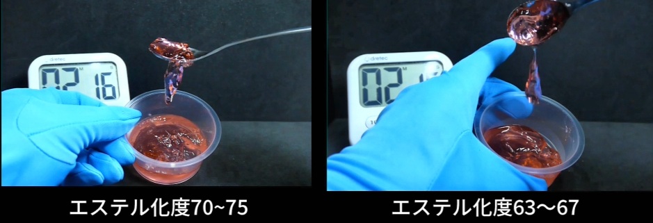 このように、エステル化度が高いほどゲル化性が強く、ゲル化速度も速いです。