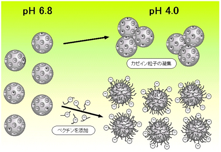 ペクチンを添加することで、カルボキシル基のマイナスチャージによりカゼインに吸着して、表面をコーティングし凝集を防止できます。