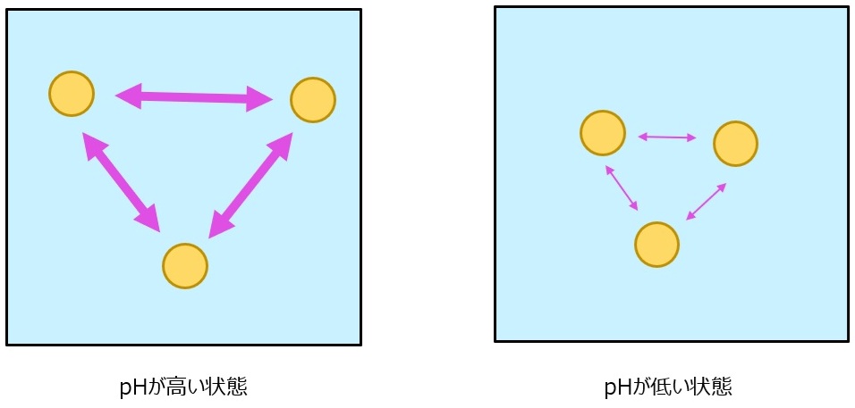 pHを低下させることで、HMペクチン中のカルボキシル基のイオン反発が抑制され、さらにペクチン分子同士の距離が近くなります。