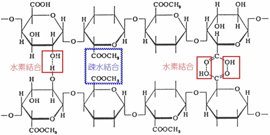 HMペクチンの主なゲル構造は、ヒドロキシ基やカルボキシル基間の水素結合と、メチルエステル基間の疎水的な結合により形成されています。