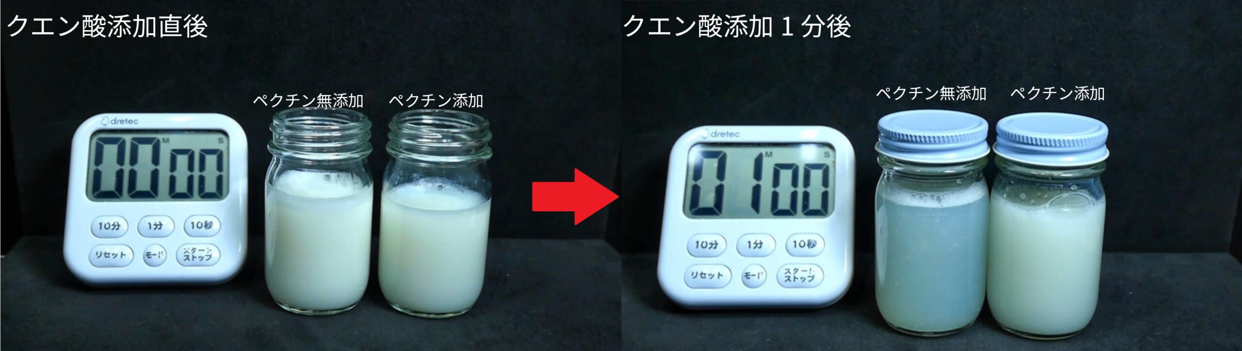クエン酸添加1分後には、無添加品は乳タンパク質が凝集して分離が起きています。