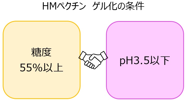 これらの条件が揃い、分子同士が十分近づくことでHMペクチンのゲル構造が形成されます。