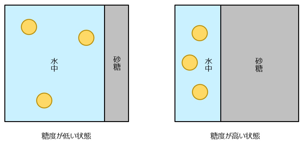 糖度が上昇すると水中のペクチン濃度が上昇し、分子同士の距離が近くなります。